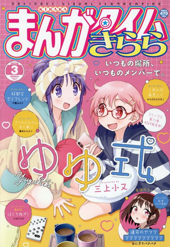 『まんがタイムきらら』2026年3月号、発売されました。表紙は『ゆゆ式』。お部屋でくつろぐ縁とゆずこ。パジャマパーティー? あたたかそうな格好で、スマホを見ながらなにか楽しそうに語らっているのですね。唯は画面のこちらがわ? 用意されたココアのカップはみっつあるから、きっとここにはいつもの三人が揃っているのでしょうね。『運命のヤマダダダダダダダダダダ』の巻頭カラー告知カットもございます。
