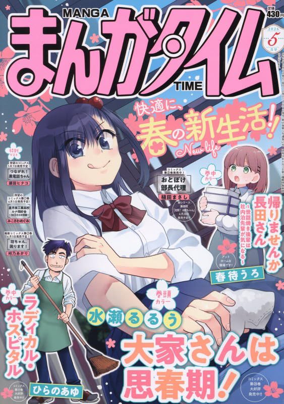 『まんがタイム』2026年5月号、発売されました。表紙は『大家さんは思春期!』。新年度のはじまり。新入学や就職もろもろで、生活が変わるシーズンでもありますよね。だからでしょうか。はりきって掃除をするチエちゃんが頼もしくも登場です。これはやはり、新しい店子を迎える準備なのでしょうか。一度入居して馴染めばそうそう出られない快適アパートの見せ所ですね。『帰りませんか長田さん』からは、資料、バインダーを運ぶ吉野さん。『ラディカル・ホスピタル』榊先生はエプロンしてホウキを持って、これ、なんか喫茶店のマスターなのでは?