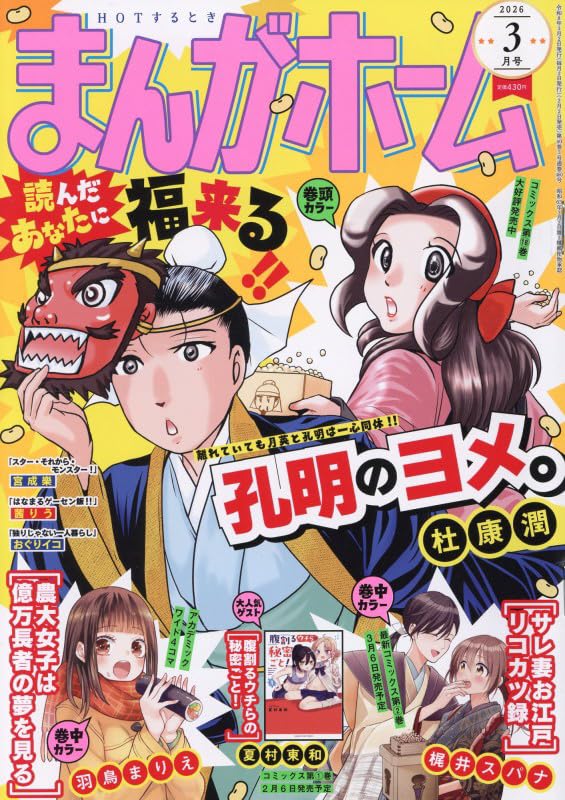 『まんがホーム』2026年3月号、発売されました。表紙は『孔明のヨメ。』。お題は節分ですね。鬼の面をつけた孔明に、豆を投げる月英です。普段仲よくしているふたりですけど、今日だけは鬼は外、心を鬼にして豆を投げるわけですが、こうして対決するにも策を練ったりはしないみたいです。『農大女子は億万長者の夢を見る』未悠は恵方巻き。『サレ妻お江戸リコカツ録』裃姿の麗から豆を授かる早苗のイラストがございます。
